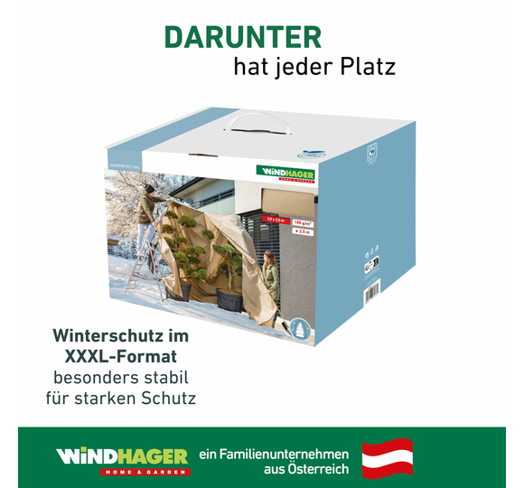 Eine Vlieshaube hilft dabei, Topfpflanzen, (Jung-)Bäume und Sträucher im Garten während der kalten Jahreszeit vor Frost und Wind zu schützen. Im späten Herbst, kurz bevor der Winter einkehrt, gilt es die Pflanzen gut einzupacken. Zweige und sperrige Pflanzen können, vor Anbringung des Winterschutzes, mit einer Schnur, wie zum Beispiel dem Kokos-Baumanbinder von Windhager, zusammengebunden werden. Danach können Sie die Vlieshaube ganz einfach über die Pflanze ziehen, den Reißverschluss zumachen und die Kordel am unteren Ende zuziehen. Achten Sie darauf, dass die gesamte(n) Pflanze(n) von der Vlieshaube bedeckt und keine Zweige oder Blätter mehr sichtbar sind. Bei Kübelpflanzen sollte auch der Topf geschützt werden. Das funktioniert schnell und unkompliziert mit einem Topfschutz von Windhager. Für rundum gut geschützte Pflanzen können Sie den Topf zusätzlich auf eine Topfunterlage stellen.