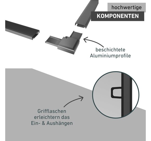 • HOCHWERTIGE KOMPONENTEN – beschichtete Aluminiumprofile, robustes Fiberglasgewebe, umlaufende Dichtungsbürsten und erleichternde Grifflaschen