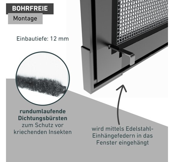 Dank dem reißfesten Gewebe aus Fiberglas und den rundumlaufenden Dichtungsbürsten finden weder fliegende noch kriechende Insekten einen Weg in Ihr Zuhause - die Sicht nach draußen bleibt dabei einwandfrei. Die Grifflaschen erleichtern Ihnen das Aus- und Einhängen des Fensters, welches durch Edelstahl-Einhängefedern montiert wird – ganz ohne bohren zu müssen!