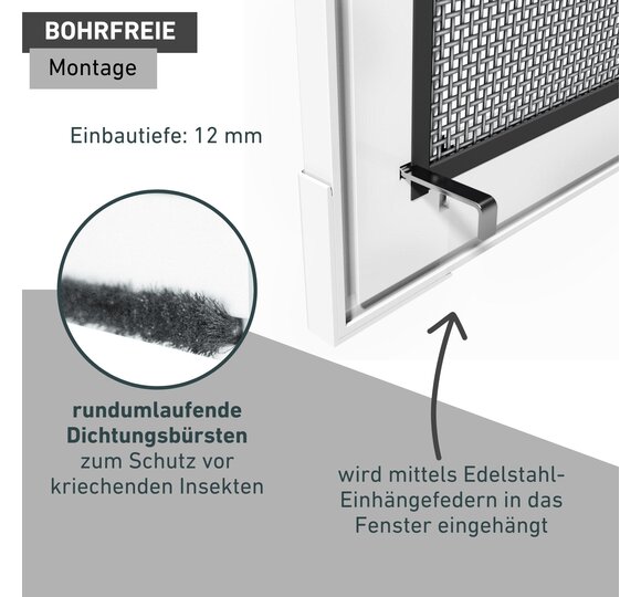 Dank dem reißfesten Gewebe aus Fiberglas und den rundumlaufenden Dichtungsbürsten finden weder fliegende noch kriechende Insekten einen Weg in Ihr Zuhause - die Sicht nach draußen bleibt dabei einwandfrei. Die Grifflaschen erleichtern Ihnen das Aus- und Einhängen des Fensters, welches durch Edelstahl-Einhängefedern montiert wird – ganz ohne bohren zu müssen!