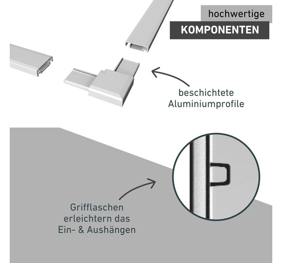 - HOCHWERTIGE KOMPONENTEN – beschichtete Aluminiumprofile, robustes Fiberglasgewebe, umlaufende Dichtungsbürsten und erleichternde Grifflaschen