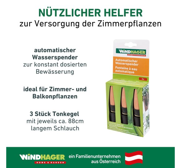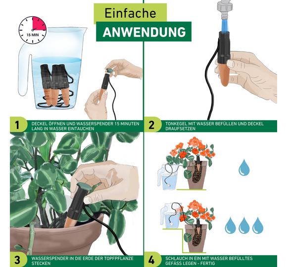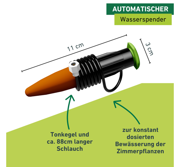 Die Pflanze holt sich über den Tonkegel und Schlauch die Wassermenge, die sie benötigt und wird nicht überwässert. Ideal bei längerer Abwesenheit.