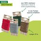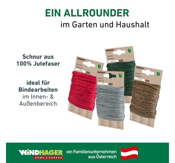 Diese gezwirbelte Dekoschnur aus nachhaltiger Jute darf in keinem Haushalt fehlen. Jute ist ein nachwachsender Rohstoff, welcher sich durch seine besonders robuste und witterungsbeständige Eigenschaft auszeichnet. So ist die Schnur für diverse Bindearbeiten und Dekorationen im Haus sowie im Außenbereich geeignet. Ob auf dem weihnachtlichen Festtisch, für die Hochzeitsdekoration oder als Schleife auf Geschenken – die Schnur ist die richtige Wahl für viele verschiedene Dekoarrangements. Im Garten lassen sich beispielsweise Winterschutzprodukte befestigen oder Pflanzen an Rankhilfen anbinden. Erhältlich ist die Juteschnur in den Farben rot, grün, braun und grau.