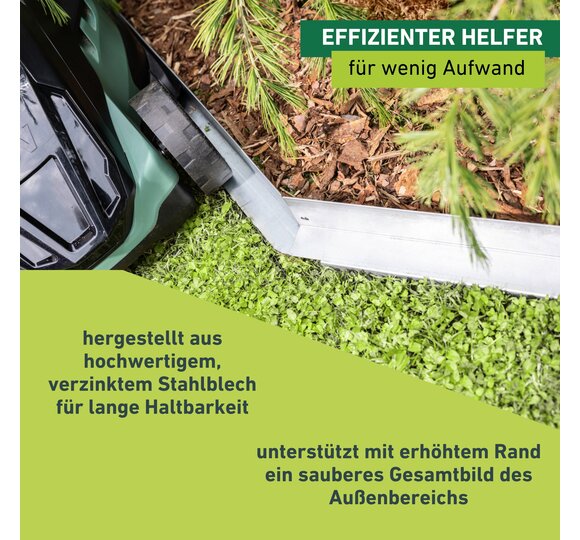 Mit der Rasenkante EASYCUT wird der Traum vom gepflegten Garten Wirklichkeit. Sie ist optimal zur Abtrennung von Rasen, Beeten und Gehwegen geeignet und unterstützt mit erhöhtem Rand ein sauberes Gesamtbild des Außenbereichs. Hochwertiges, verzinktes Stahlblech lässt die Rasenkante unter Einfluss der Witterung nicht rosten und sorgt so für lange Haltbarkeit.