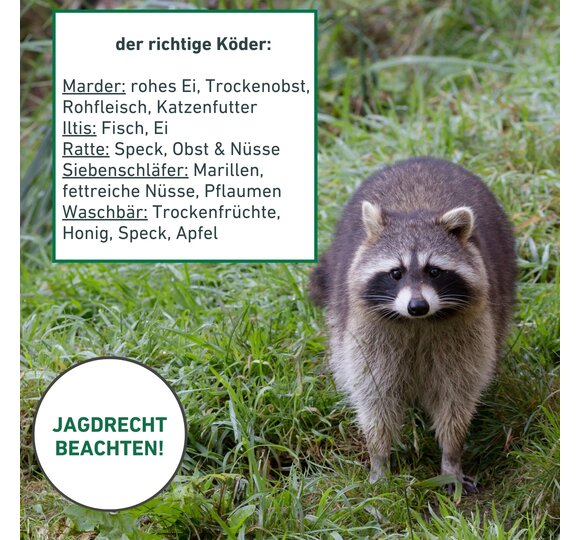 Hinweis: Maulwürfe, Marder und Waschbären sind wildlebende, herrenlose Tiere, die meist dem Jagdrecht unterliegen. Beachten Sie daher unbedingt die jeweils gültigen rechtlichen Vorgaben (Gesetze, Verordnungen u. ä.), z. B. das Bundesjagdgesetz in Deutschland oder das jeweilige Landesjagdrecht in den österreichischen Bundesländern.