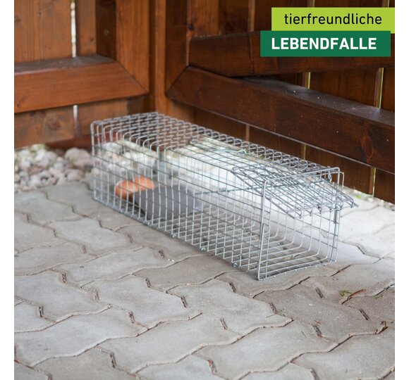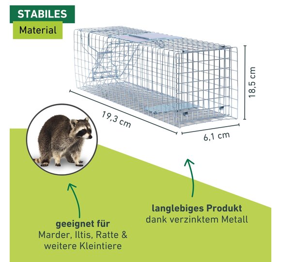 Wenn Marder und andere kleine Nagetiere sich an Ihrem Eigentum zu schaffen machen, ist das ärgerlich. Zerbissene Autokabel, geplünderte Vorratskammer und Verschmutzungen sind dann oft die Folge. Mit einer Lebendfalle lassen sich die ungebetenen Gäste einfangen und an einer geeigneten Stelle unbeschadet wieder freisetzen. Mit dieser Art der Schädlingsbekämpfung sorgen Sie tier- und umweltfreundlich für ein schädlingsfreies Zuhause – ganz im Einklang mit der Natur. Die Falle ist mit einer Größe von 19,3x6,1x18,5 cm für den Lebendfang von Mardern, Ratten, Siebenschläfern und Waschbären geeignet. Sie kann sowohl in Außen- als auch in Innenbereichen angewendet werden.