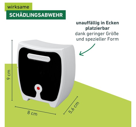 Aber das ist noch nicht alles: das Gerät wirkt völlig ohne Gift oder Chemie und ist daher für Mensch und Haustier unbedenklich. Seine geringe Größe macht den Ultraschallvertreiber zu einem unauffälligen Hilfsmittel in der Schädlingsbekämpfung. Er ist zudem optimal für die Platzierung in Ecken geeignet.