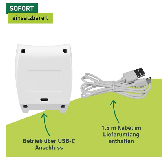 Die Anwendung ist denkbar einfach: Der Betrieb läuft über USB-C Anschluss. Maus- und Rattenabwehr ULTRA COMPACT einfach mit dem mitgelieferten 1,5 m langen Kabel an eine Steckdose mit USB-Port anschließen oder einen USB Netzadapter (nicht inklusive) verwenden, fertig.