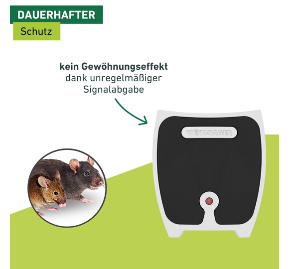 Sowohl bei akutem Befall, als auch zur Vorbeugung - der kompakte Vertreiber hält unerwünschte Nager mithilfe von Ultraschall Frequenzen zuverlässig fern. Seine intermittierende, also unregelmäßige, Signalabgabe verhindert, dass sich die Schädlinge an die Frequenzen gewöhnen. Dadurch bleibt der Abwehreffekt auch bei dauerhafter Nutzung stets erhalten.
