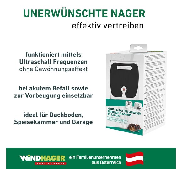 Mäuse und Ratten in Haus, Dachboden oder Schuppen sind eine wahre Plage. Nicht nur unangenehm, sondern auch sehr unhygienisch. Um sie wieder loszuwerden, gibt es verschiedene Möglichkeiten. Ultraschallgeräte, die auch gegen Marder wirken, klassische Mausefallen oder tierfreundliche Lebendfallen. Mit den Windhager Produkten zur Mäuse- und Rattenbekämpfung können Sie sich wieder ganz entspannt in Ihren Räumen bewegen.