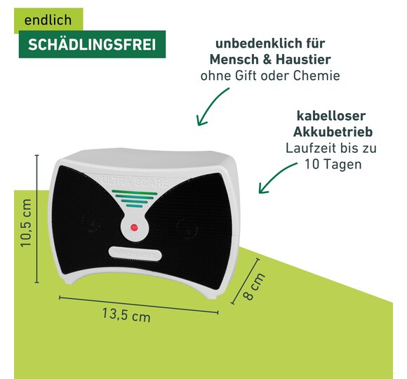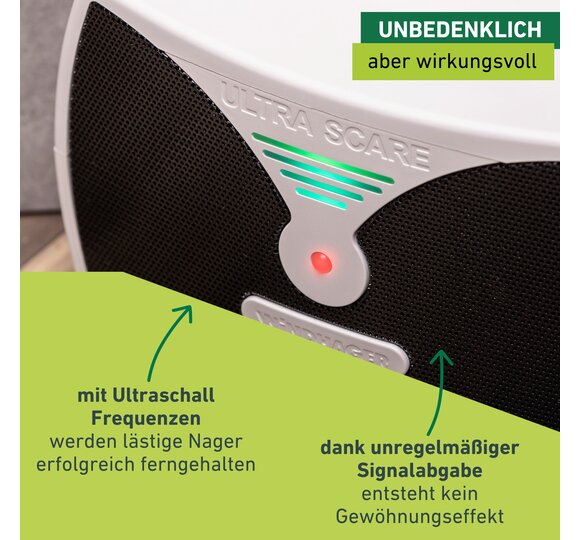 Der Mäuse- & Rattenvertreiber ULTRA SCARE schlägt unliebsame Störenfriede wie Ratte, Maus, Siebenschläfer, Marder oder Waschbär wirksam mithilfe von Ultraschall Frequenzen in die Flucht. Dank unregelmäßiger Signalabgabe entsteht kein Gewöhnungseffekt. Somit bleibt der Schutz auch bei dauerhaftem Einsatz aufrecht. Und das Beste: er ist dabei für Mensch und Haustier vollkommen unbedenklich, denn er wirkt ganz ohne Gift oder Chemie.