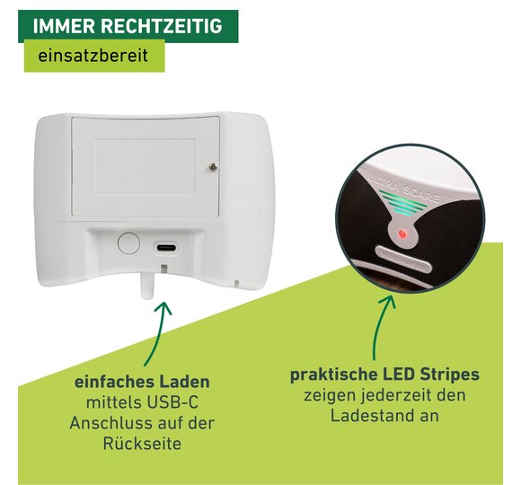 Akkubetrieben mit einer Laufzeit von bis zu 10 Tagen ist dieser Schädlingsschutz kabellos an jedem gewünschten Ort einsetzbar. Praktische LED-Stripes zeigen jederzeit den Ladestand an, sodass das Gerät immer rechtzeitig wieder via USB-C Anschluss aufgeladen werden kann.