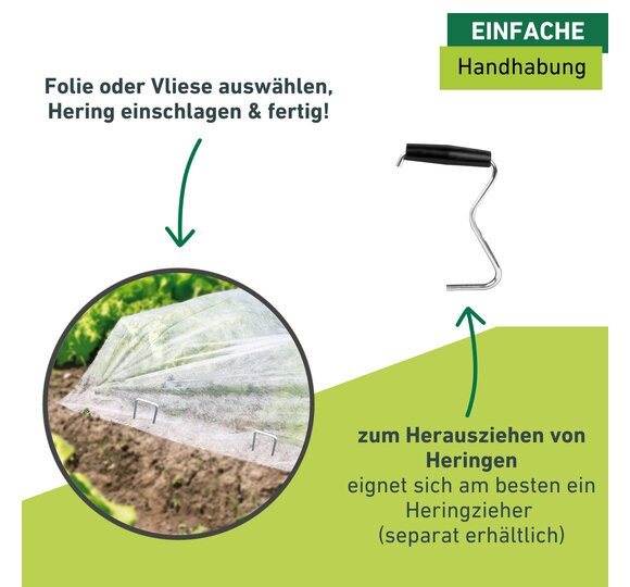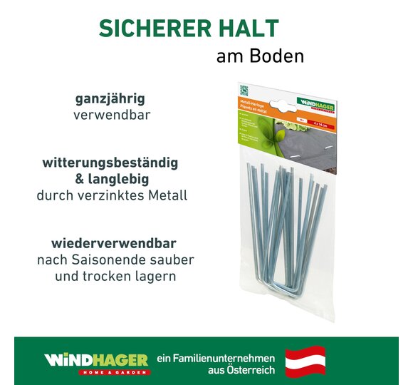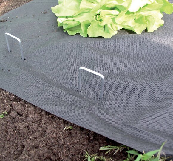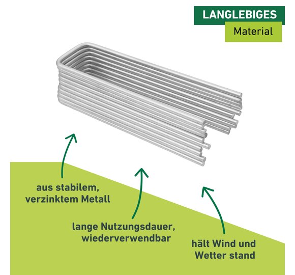 Aus verzinktem Metall, zur stabilen Befestigung von Vliesen und Folien im Erdreich.