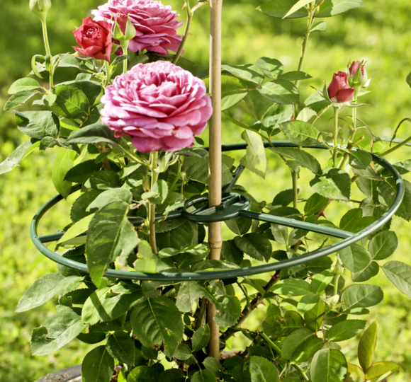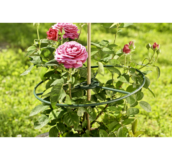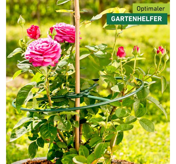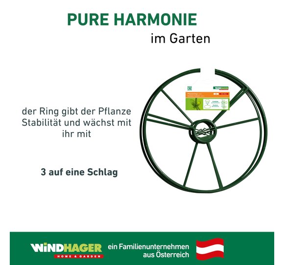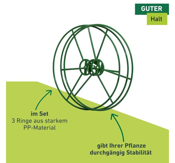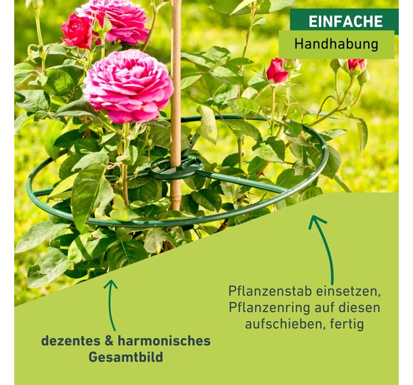 Einfache Handhabung - einen Pflanzstab einsetzen und den Pflanzenring aufschieben. Der Ring gibt der Pflanze Stabilität und wächst mit ihr mit.