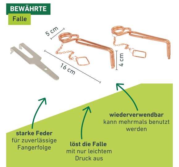- BEWÄHRTE FALLE – Zuverlässige und langjährig bewährte Falle mit wiederverwendbaren Stellplättchen und Kettchen