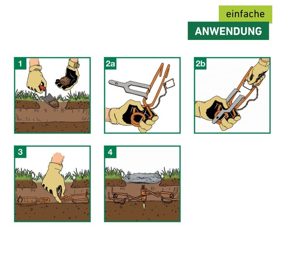 Nachdem ein Wühlmausgang ausfindig gemacht wurde, muss die Falle nur noch platziert werden. Die Falle SUPER STRONG sollte ungefähr 10 cm unter der Erdoberfläche gesetzt werden. Danach muss das Loch wieder verdeckt werden. Hierfür eignet sich beispielsweise die zuvor entfernte Grasnarbe oder ein Eimer. Zusätzlich kann die Stelle an der sich die Falle befindet mit einer Markierflagge (Art.-Nr. 05317) gekennzeichnet werden. So lässt sich die Wühlmausfalle danach wieder leichter finden.