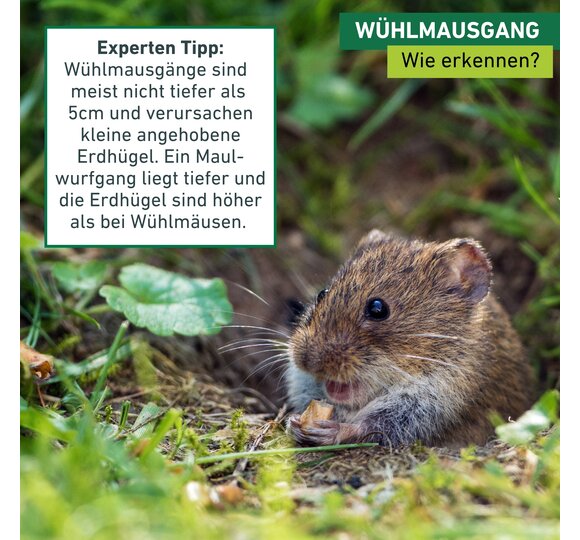 Gräbt man einen Gang auf, wird die Wühlmaus ihn innerhalb kürzester Zeit wieder verschließen, während ein Maulwurf eher einen neuen Gang darunter graben würde. So lassen sich Gänge von Wühlmäusen und Maulwürfen auseinanderhalten.