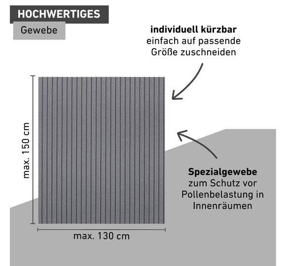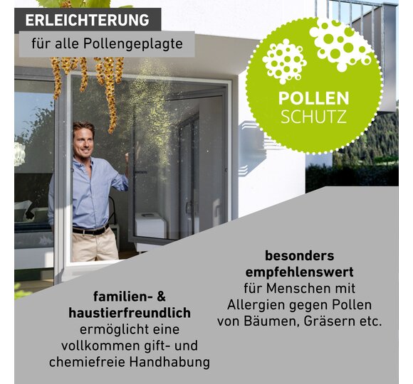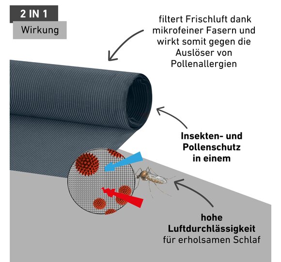 Den Sommer ohne gerötete Augen oder triefende Nase genießen - geht das? Natürlich. Mit dem Wetter- und UV-beständigen Spezialgewebe zur Reduktion der Pollenbelastung ist Ihnen erholsamer Schlaf in der Pollenflugsaison kein Fremdwort mehr! Außerdem eignet sich das Gewebe auch als Insektenschutz und kann zum Nachrüsten für Insektenschutz Rahmenfenster und -türen verwendet werden.