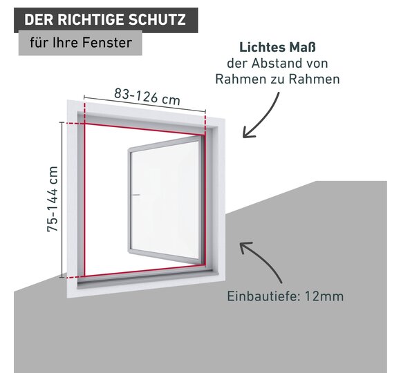 - SÄGEFREI - stufenlos teleskopierbares Rahmenfenster, mind. 60x68 cm bis max. 96x114 cm oder min. 75x83 cm bis max. 126x144 cm