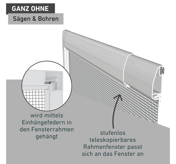 - SCHNELLE MONTAGE – wird mittels Einhängefedern in den Fensterrahmen gehängt, benötigter Platz (Einbautiefe): 12 mm