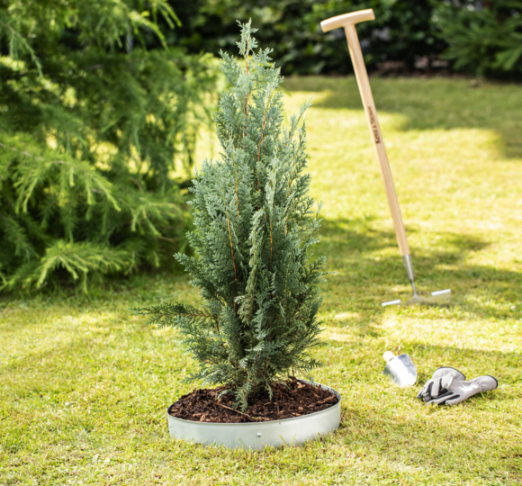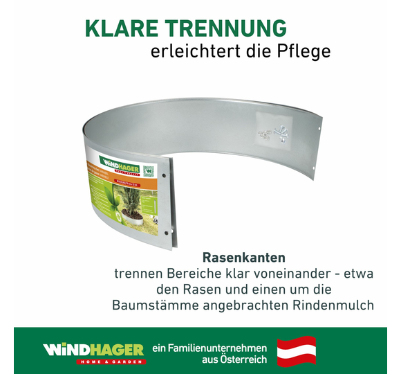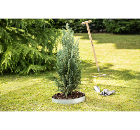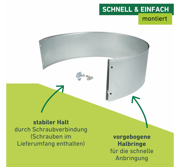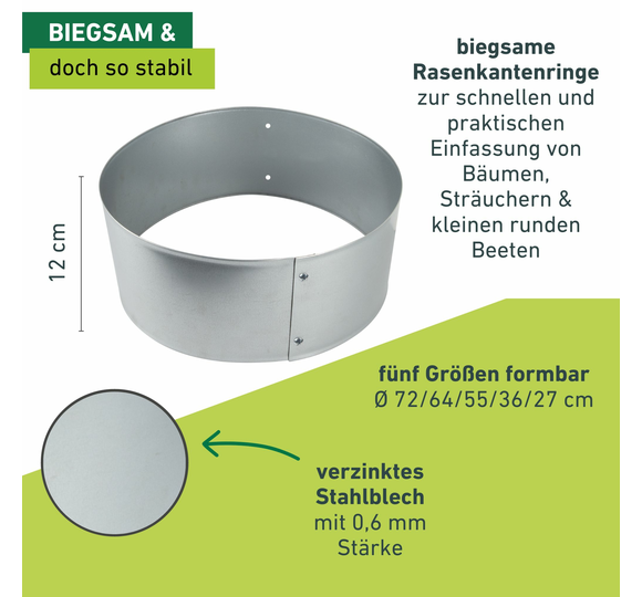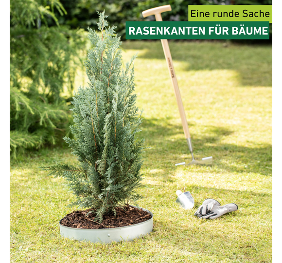 Die Rasenkantenringe aus verzinktem Stahlblech sind ideal zur Einfassung von Bäumen, Sträuchern und kleinen, runden Beeten. Sie trennen den Rasen sauber vom bepflanzten Bereich, schützen vor allem junge Pflanzen beim Rasenmähen und werden zum dekorativen Element im Garten.