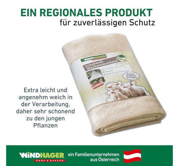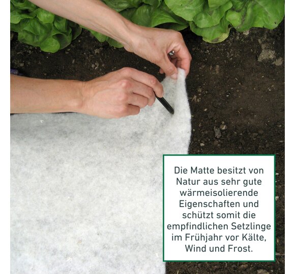 Die Matte besitzt von Natur aus sehr gute wärmeisolierende Eigenschaften und schützt somit die empfindlichen Setzlinge im Frühjahr vor Kälte, Wind und Frost. Extra leicht und angenehm weich in der Verarbeitung, daher sehr schonend zu den jungen Pflanzen. In Österreich hergestellt - aus Wolle regionaler Herkunft.