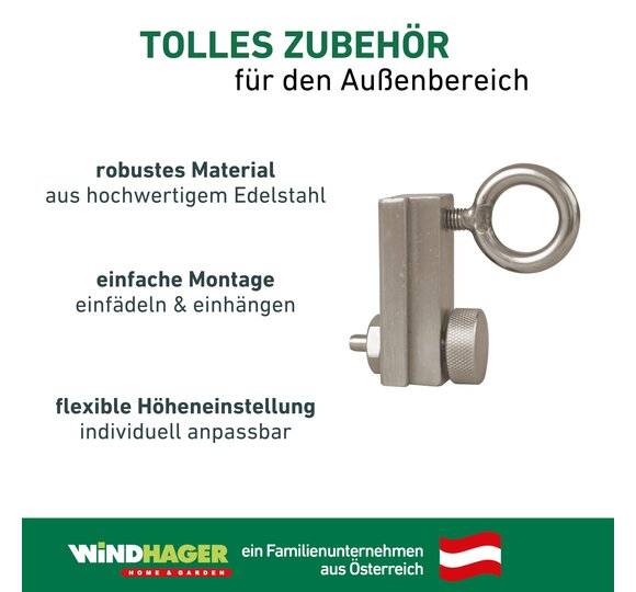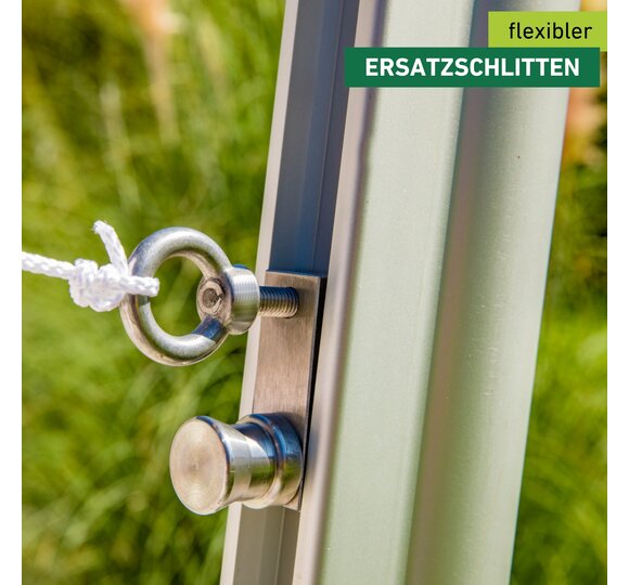 Der Schlitten für den Windhager Sonnensegelmast Premium kann als Zweitschlitten verwendet werden – das Seil des Sonnensegels wird durch den oberen Schlitten gefädelt, aber erst am unteren Schlitten befestigt. Wird der obere Schlitten einfach nach oben oder unten geschoben, ändert sich die Position des Segels. So kann das Sonnensegel dem Sonnenstand angepasst werden, ohne das Sonnensegel neu befestigen zu müssen.