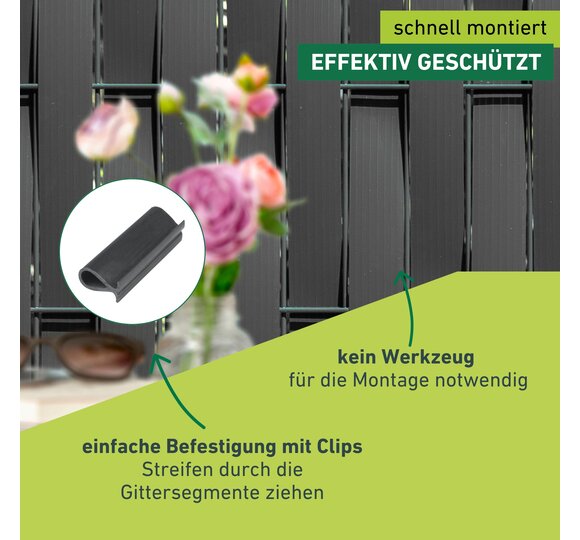 Egal, wie schön der Garten ist, Zuschauer sind oft unerwünscht. Mit den Sichtschutzstreifen lassen sich Gitterzäune sehr individuell verkleiden: die Streifen werden exakt auf die benötigte Höhe zugeschnitten und dann oben und unten mit den im Set enthaltenen Clips befestigt. Der Clou: zum Befestigen wird kein Werkzeug benötigt.