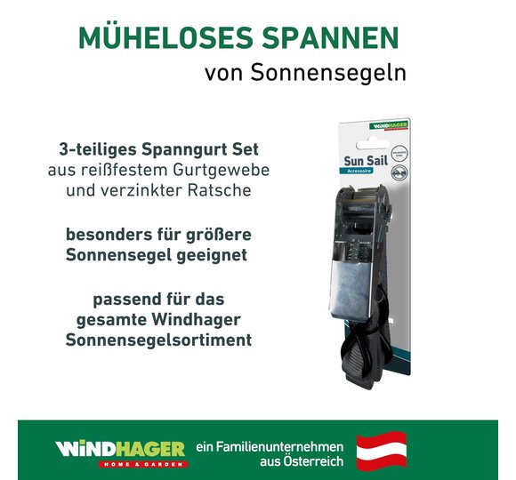 - DAS IDEALE ZUBEHÖR – Das 3-teilige Spanngurt Set mit Ratsche ist besonders für größere Sonnensegel geeignet und passend für das gesamte Windhager Sonnensegelsortiment