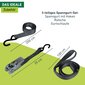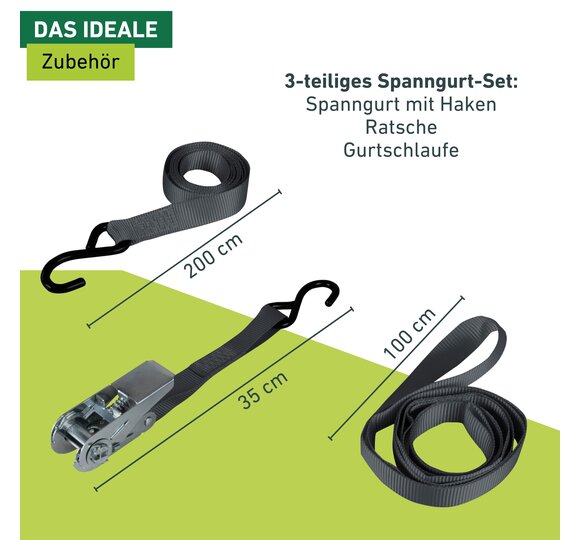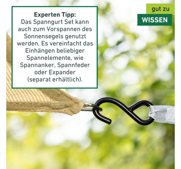 - Das Spanngurt Set mit Ratsche kann auch zum Vorspannen des Segels genutzt werden. Es vereinfacht ein straffes Spannen und das darauffolgende Einhängen beliebiger Spannelemente, wie Spannanker, Spannfeder oder Expander (separat erhältlich).
