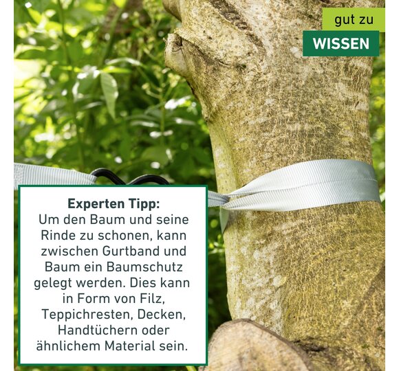 - Um den Baum und seine Rinde zu schonen, kann zwischen Gurtband und Baum ein Baumschutz gelegt werden. Dies kann in Form von Filz, Teppichresten, Decken, Handtüchern oder ähnlichem Material sein.