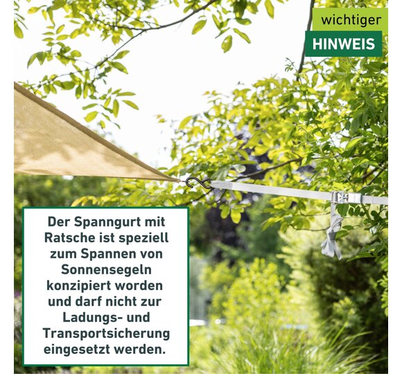 Der Spanngurt mit Ratsche ist speziell zum Spannen von Sonnensegeln konzipiert worden und darf nicht zur Ladungs- und Transportsicherung eingesetzt werden.