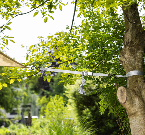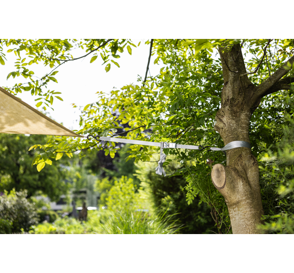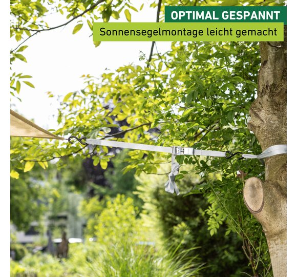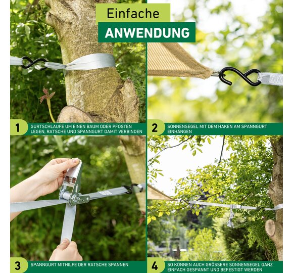 Die Gurtschlaufe kann einfach um einen Baum oder Pfosten im Garten gelegt werden. Ratsche und Spanngurt werden dann mit der Gurtschlaufe verbunden. Das Sonnensegel wird mit dem praktischen Haken am Spanngurt eingehängt und schon kann der Gurt mithilfe der Ratsche mühelos gespannt werden.