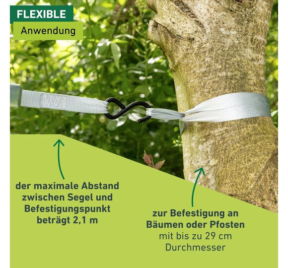 - FLEXIBLE ANWENDUNG – Die Gurtschlaufe erlaubt die Fixierung des Segels an Bäumen oder Pfosten mit bis zu ∅ 29 cm, der maximale Abstand zwischen Segel und Befestigungspunkt beträgt 2,1 m