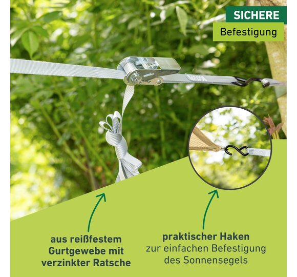 - Zurrgurt-Ratschen sind sehr zugstark. Achten Sie auf die Belastbarkeit Ihres Sonnensegels und der Befestigungen.