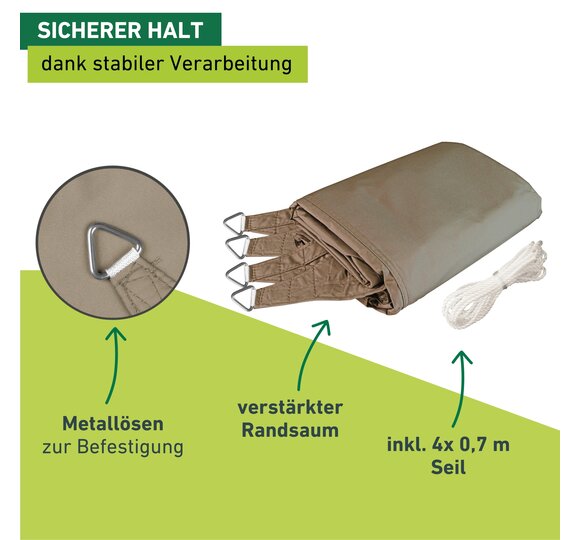 - BESTÄNDIG VERARBEITET - Der verstärkte Randsaum macht das Sonnensegel reißfest und sorgt gemeinsam mit den Metallösen für festen Halt.