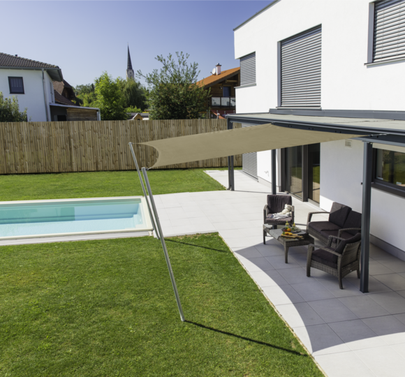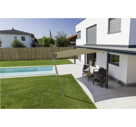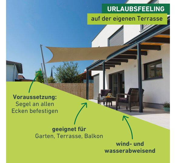 Angenehme Beschattung durch Sonnensegel hat außerdem den Vorteil, dass kein kostbarer Platz als Stellfläche verloren geht, wie bei einem Sonnenschirm. Und im Winter kann das Sonnendach einfach abgenommen und absolut platzsparend verstaut werden. Sonnensegel eignen sich nicht nur für Terrassen, auch am Balkon, auf der Wiese, über dem Pool oder der Sandkiste lässt sich so ein tolles Sonnendach zaubern. Einzige Voraussetzung: das Segel muss an 4 Punkten befestigt werden können.