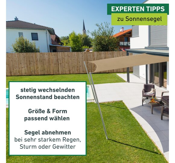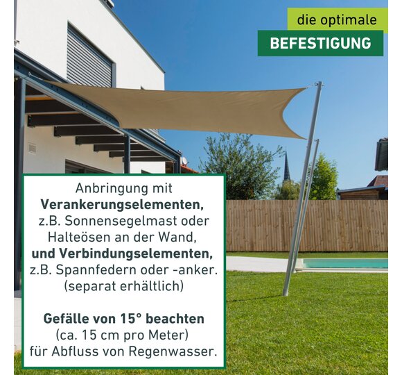 Wichtig ist, von vornherein an das nötige Gefälle zu denken und die ersten Befestigungen hoch genug anzubringen. Das Gefälle von 15° (ca. 15 cm pro Meter) dient dazu, dass der Regen sich nicht auf dem Segel sammelt, sondern ablaufen kann. Regen, der sich auf dem Sonnensegel sammelt, macht das Segel nicht nur schwerer und erhöht die Gesamtlast auf der Befestigung, sondern kann im Extremfall auch zu einer Verformung des Gewebes führen, die sich auch durch erneutes, festeres Spannen nicht beheben lässt. Mit der richtigen Befestigung sind Sonnensegel sehr windstabil. Nichtsdestotrotz ist es empfehlenswert, das Segel bei Unwetter, Gewitter, sehr starkem Regen oder Sturm abzunehmen.