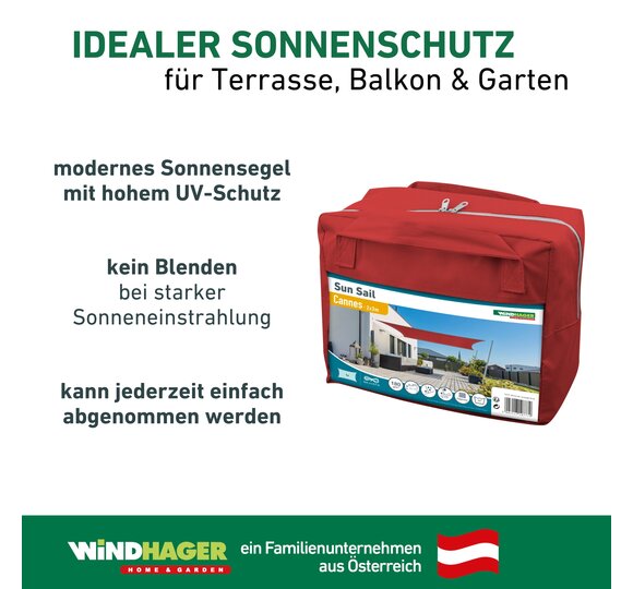 Angenehme Beschattung durch Sonnensegel hat außerdem den Vorteil, dass kein kostbarer Platz als Stellfläche verloren geht, wie bei einem Sonnenschirm. Und im Winter kann das Sonnendach einfach abgenommen und absolut platzsparend verstaut werden. Sonnensegel eignen sich nicht nur für Terrassen, auch am Balkon, auf der Wiese, über dem Pool oder der Sandkiste lässt sich so ein tolles Sonnendach zaubern. Einzige Voraussetzung: das Segel muss an 3 Punkten befestigt werden können.