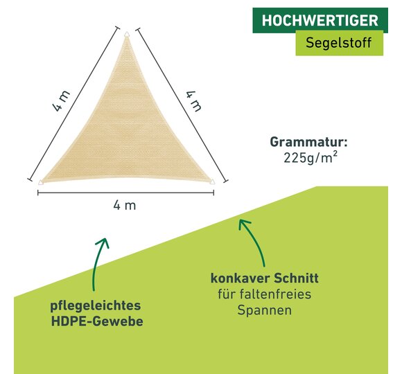 - TOP MATERIAL - Hochwertiges HDPE-Gewebe (225g/m²) mit Metallösen und verstärkten Säumen, die für festen Halt sorgen und das Segel reißfest machen.