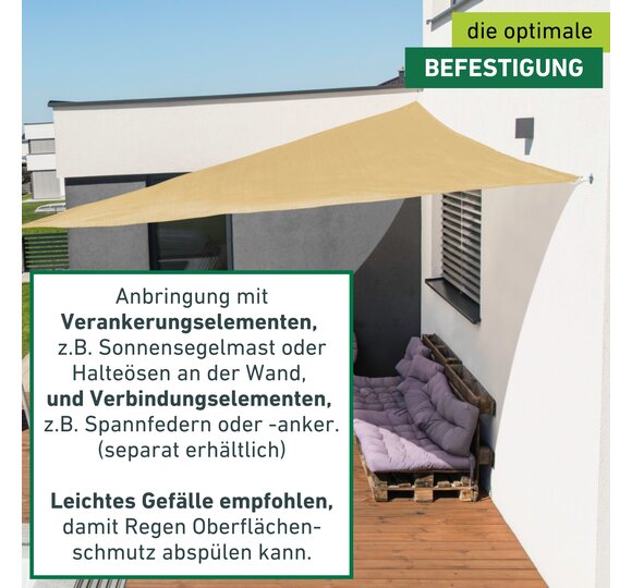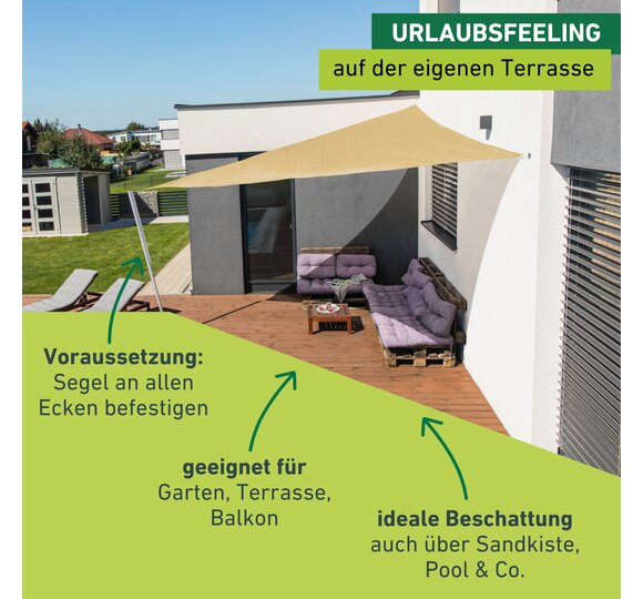 Sonnensegel eignen sich nicht nur für Terrassen, auch am Balkon, auf der Wiese, über dem Pool oder der Sandkiste lässt sich so ein tolles Sonnendach zaubern. Einzige Voraussetzung: das Segel muss an 3 Punkten befestigt werden können.
