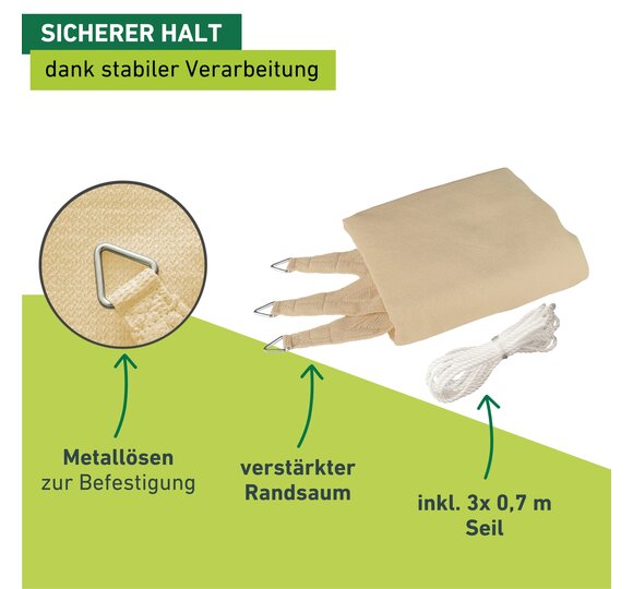 Das pflegeleichte HDPE-Gewebe des Sonnensegels CAPRI lässt sich einfach reinigen – entweder bei 30° in der Waschmaschine oder mit milder Seifenlauge. Diese wind- und wasserdurchlässige Ausführung hat den Vorteil, dass es unter dem Sonnensegel angenehm kühl bleibt, weil kein Hitzestau entsteht. Dazu fängt das Sonnensegel 90% der UV-Strahlen ab, lässt aber die angenehme frische Brise durch. Die verstärkten Säume sind bei einem Sonnensegel besonders wichtig, denn sie sorgen für einen festen Halt – und dafür, dass die Seiten auch bei Wind nicht reißen.
