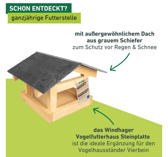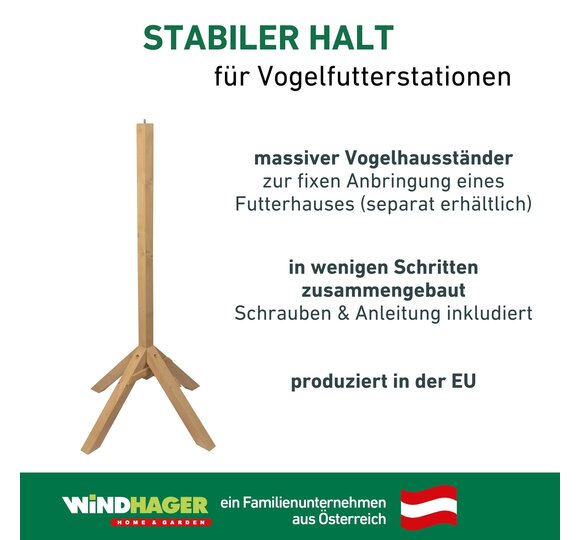 Mit dem Windhager Vogelhausständer "Vierbein" kann fast jedes Vogelhaus an einer geeigneten Stelle im Garten postiert werden. Das Massivholz Gestell mit vier Beinen hält Wind und Wetter stand, damit die Vögel den ganzen Winter über eine sichere Anflugstelle haben. Er wird als Bausatz geliefert und ist in wenigen Schritten zusammengebaut. Der Ständer wird von von unten an das Vogelhaus geschraubt; dank der inkludierter Adapterplatte aus Holz (Maße: 10 x 10 cm) passen viele große und kleine Modelle darauf.