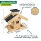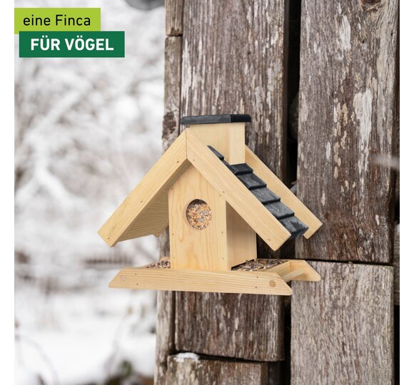 Dieser Finca statten Wildvögel in Ihrem Garten liebend gerne einen Besuch ab. Mit dem schön gestalteten Vogelhaus aus massivem Kiefernholz unterstützen Sie aber nicht nur die heimische Vogelvielfalt bei ihrer Futtersuche, sondern schaffen zudem einen dekorativen Hingucker in Ihrem Garten. Das witterungsbeständige Häuschen kann ganz einfach über den Kamin mit Vogelfutter befüllt werden, welches im Inneren dank praktischer Silobauweise stets trocken bleibt. Zudem können Vögel so ihr Geschäft nicht im Futter verrichten, was die Verbreitung von Krankheiten verhindert. Unter dem robusten, überstehenden Dach können es sich die Vögel auf den angebrachten Sitzstangen bequem machen. Der Futterstand ist jederzeit über das kleine Sichtfenster einsehbar, um die Finca bei Bedarf wieder mit Nachschub aufstocken zu können.