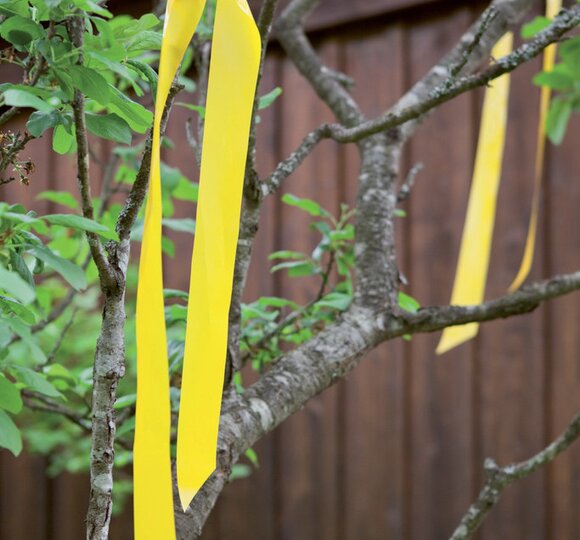 Schneiden Sie je 50 cm vom Band ab und befestigen Sie es am Ast des Baumes. Wiederholen Sie den Vorgang, damit Ihr Baum rundum geschützt ist. Nach der Saison können Sie die Bänder entfernen und im nächsten Jahr wiederverwenden.