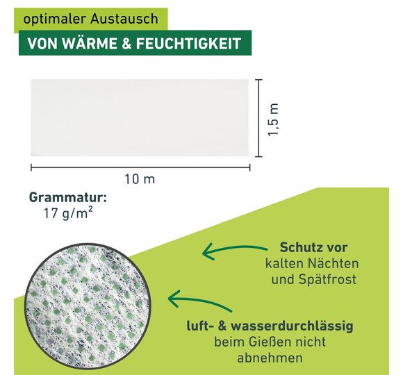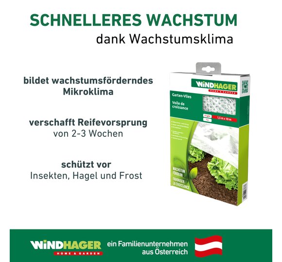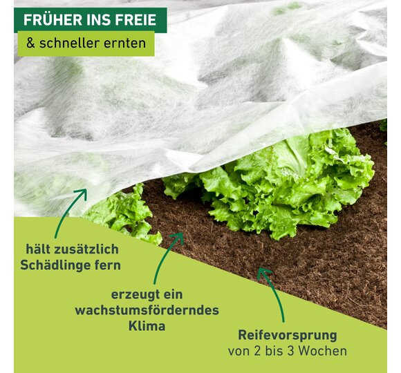 Die Bildung eines wachstumsfördernden Mikroklimas unter dem Vlies verschafft den Jungpflanzen einen Reifevorsprung von 2 bis 3 Wochen. Dies führt zu früherer Ernte und mehr Ertrag. Schützt auch vor Frost (thermische Schutzwirkung), Insekten, Wildfraß und Hagel.