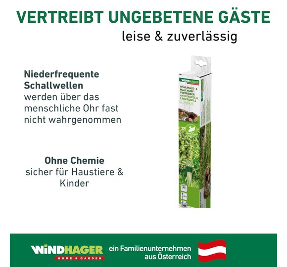 Der Mole Stop 1000 war das erste Produkt, das Windhager auf den Markt gebracht hat – und ist nach wie vor erfolgreich, denn: es funktioniert! Mittlerweile bietet die Produktpalette verschiedenste Möglichkeiten der Maulwurfvertreibung und zur Bekämpfung von Wühlmäusen.
