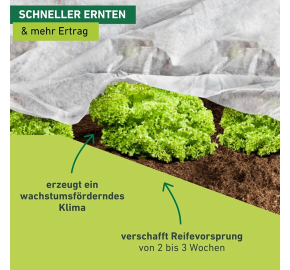 - FRÜHER ERNTEN – Das wachstumsfördernde Klima unter dem Vlies unterstützt eine schnelle Reifung. Schädlinge haben es auch schwerer, an die Pflanzen heranzukommen.
