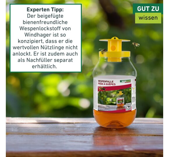 - MIT BIENENFREUNDLICHEM KÖDER – Inklusive 1 Flasche (125 ml) Windhager Wespenlockstoff, nützliche Bienen werden von diesem Köder nicht angelockt