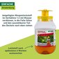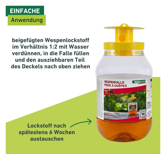 Die Anwendung ist kinderleicht: den beigefügten Wespenlockstoff im Verhältnis 1:2 mit Wasser verdünnen, in die Falle füllen und den ausziehbaren Teil des Deckels nach oben ziehen. Über die Öffnung im Deckel gelangen die Wespen mühelos ins Innere der Falle, aber nicht mehr hinaus. Dank des transparenten Kunststoffs ist der Fangerfolg direkt einsehbar. Lockstoff nach spätestens 6 Wochen austauschen.